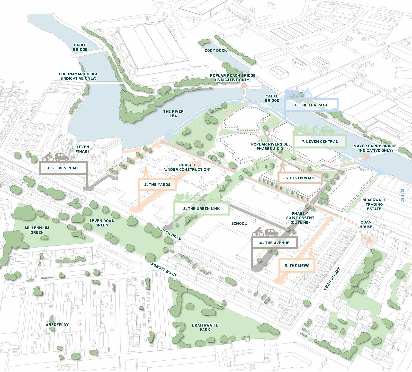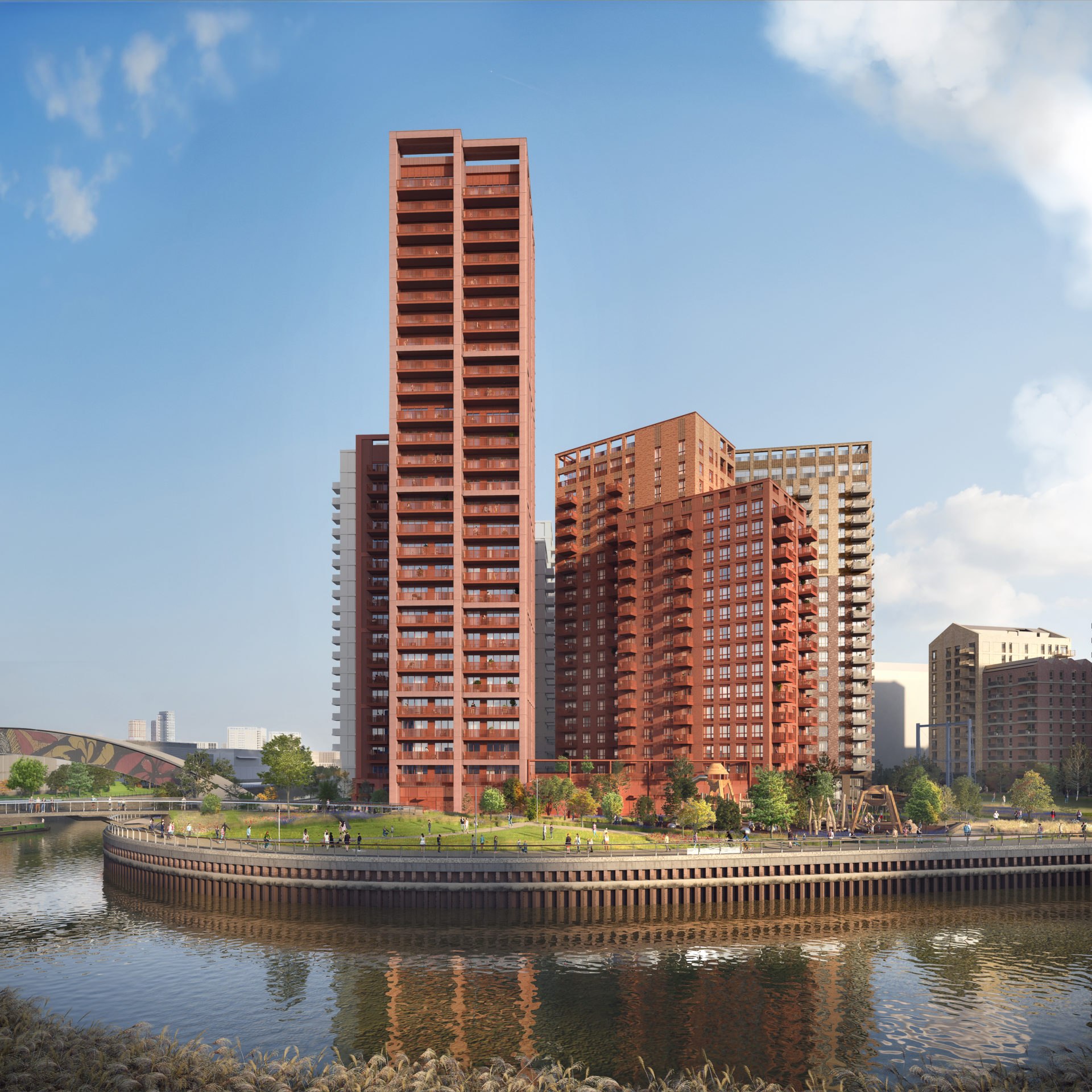 Shaped by the river, the design of Phases 2 and 3 celebrates the natural and industrial heritage of the Lower Lea Valley. Opening up the riverside, the delivery of 220m of new waterside walkways will reconnect the local community to the water and enhance public access to the River Lea through walking and cycling paths. A ‘village green’ space known as Leven Central between Phase 2 and 3 helps create a new central space maintaining views and routes both to and from the river, whilst also maximising active frontage and passive surveillance. The addition of Leven Walk will act as a key link between all phases of the project further integrating the new neighbourhood with the existing surroundings.