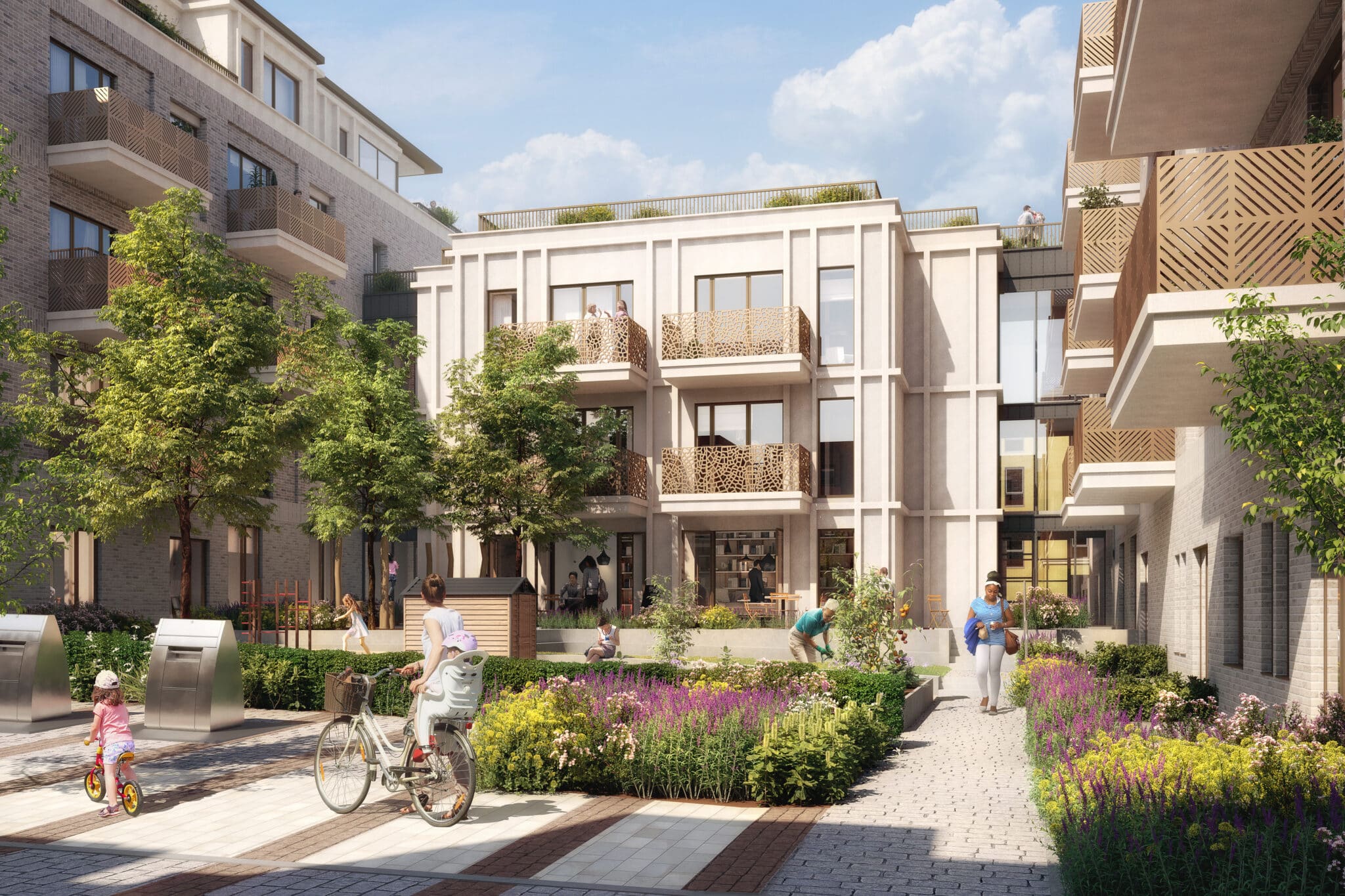 With the challenges experienced over the Covid-19 pandemic highlighting the importance of communities where residents can live, work and play within a close proximity to their homes, the local amenities provided at Howes Green contribute to supporting the ‘15-minute city’ concept. Over 1250 sqm of mixed uses feature co-working space, a cycle hub, health and fitness suite and a microbrewery with outdoor seating terraces to create a new social heart for residents and the local community. A range of residential amenities are also provided including garden rooms, cafés, landscaped courtyards and rooftop gardens with growing spaces.