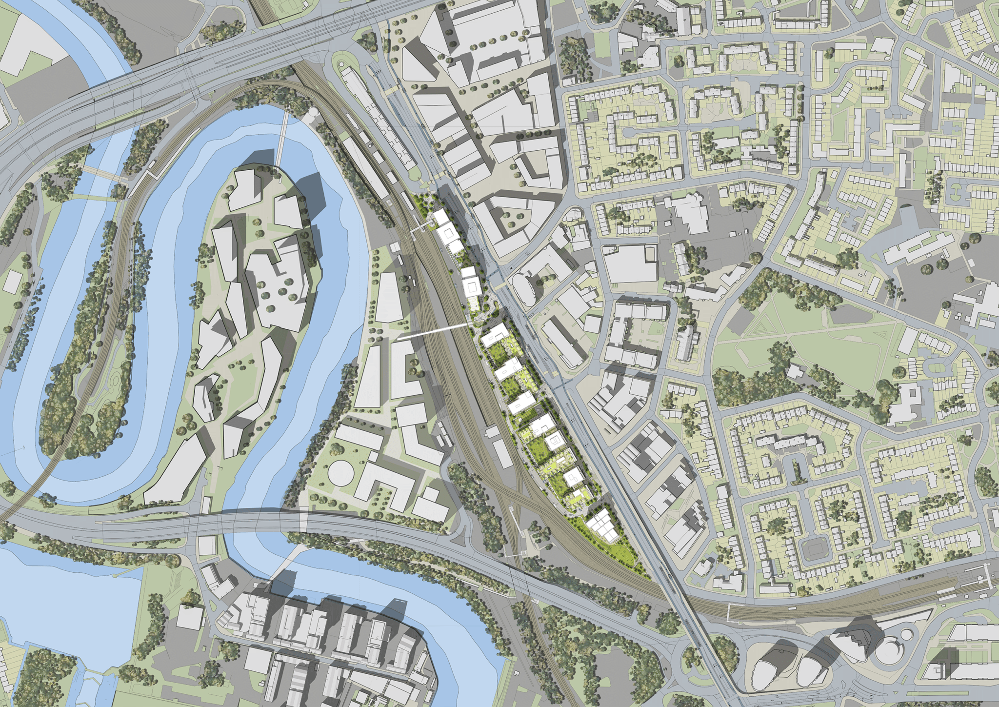 A complex and challenging location, the 2.48 hectare linear site is bounded by the DLR and Jubilee line to the west and Silvertown Way to the east – Britain’s first flyover which since 1934 has severed the site from Canning Town.