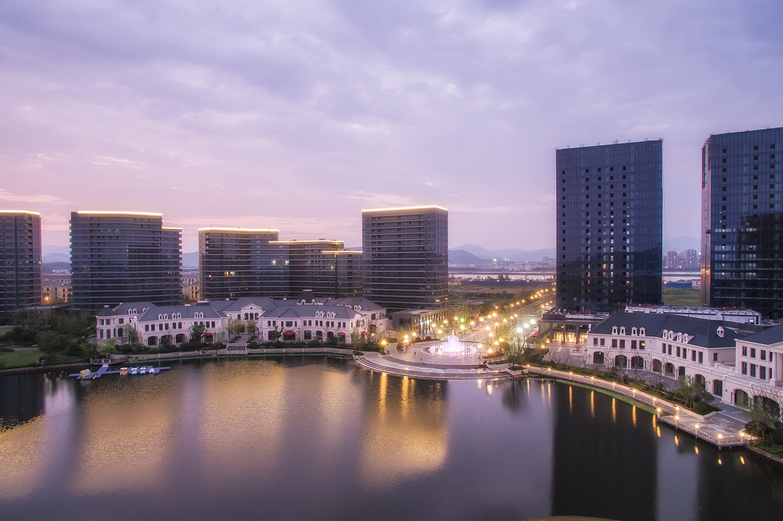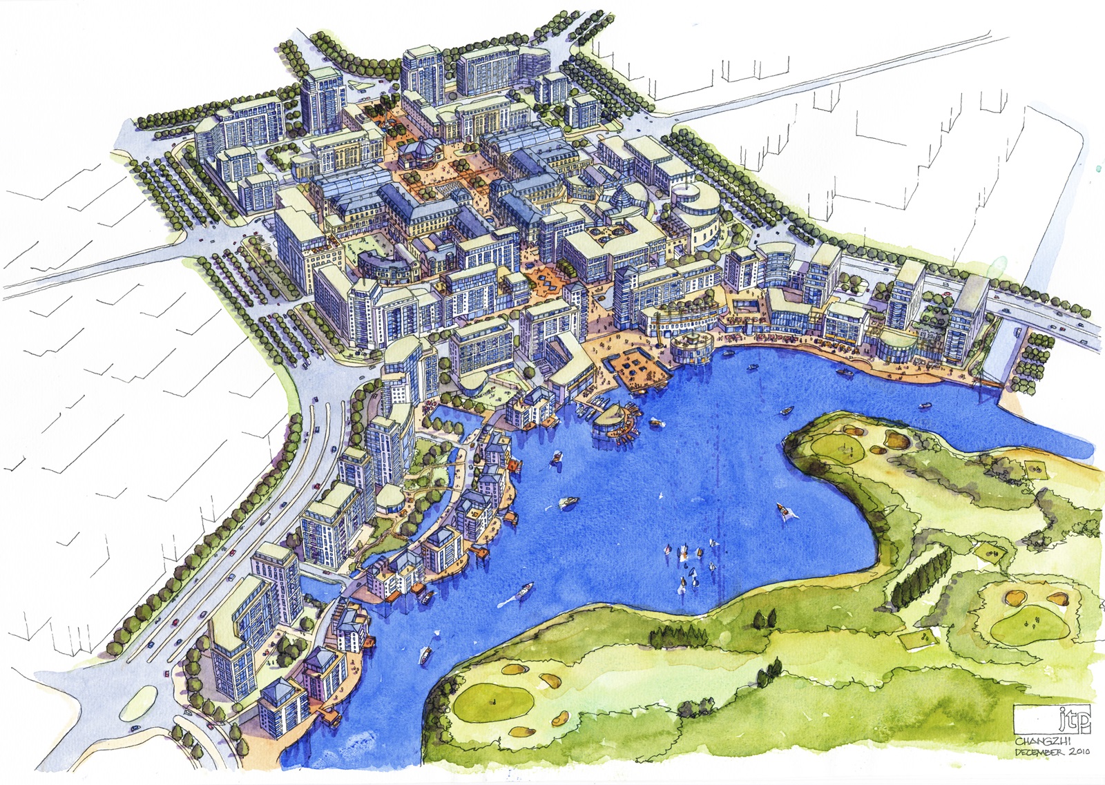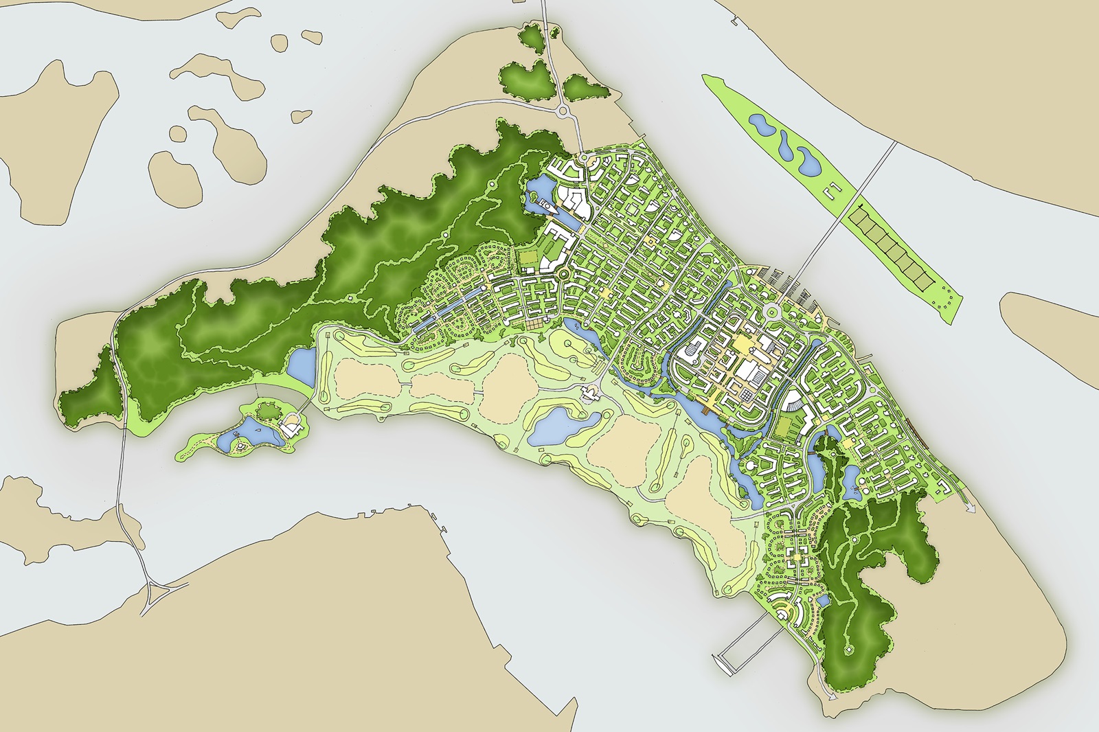 The masterplan draws on the best traditions of European and Chinese urban design, creating a coherent framework that balances natural landscapes, waterways and urban life. At its heart is a compact town centre, defined by a perimeter canal and a series of squares and streets, which forms the focal point of residential, commercial, cultural, and leisure activities. A dedicated cultural quarter, connected via an urban park, links the town centre to the island’s two hills, strengthening both accessibility and public realm quality.