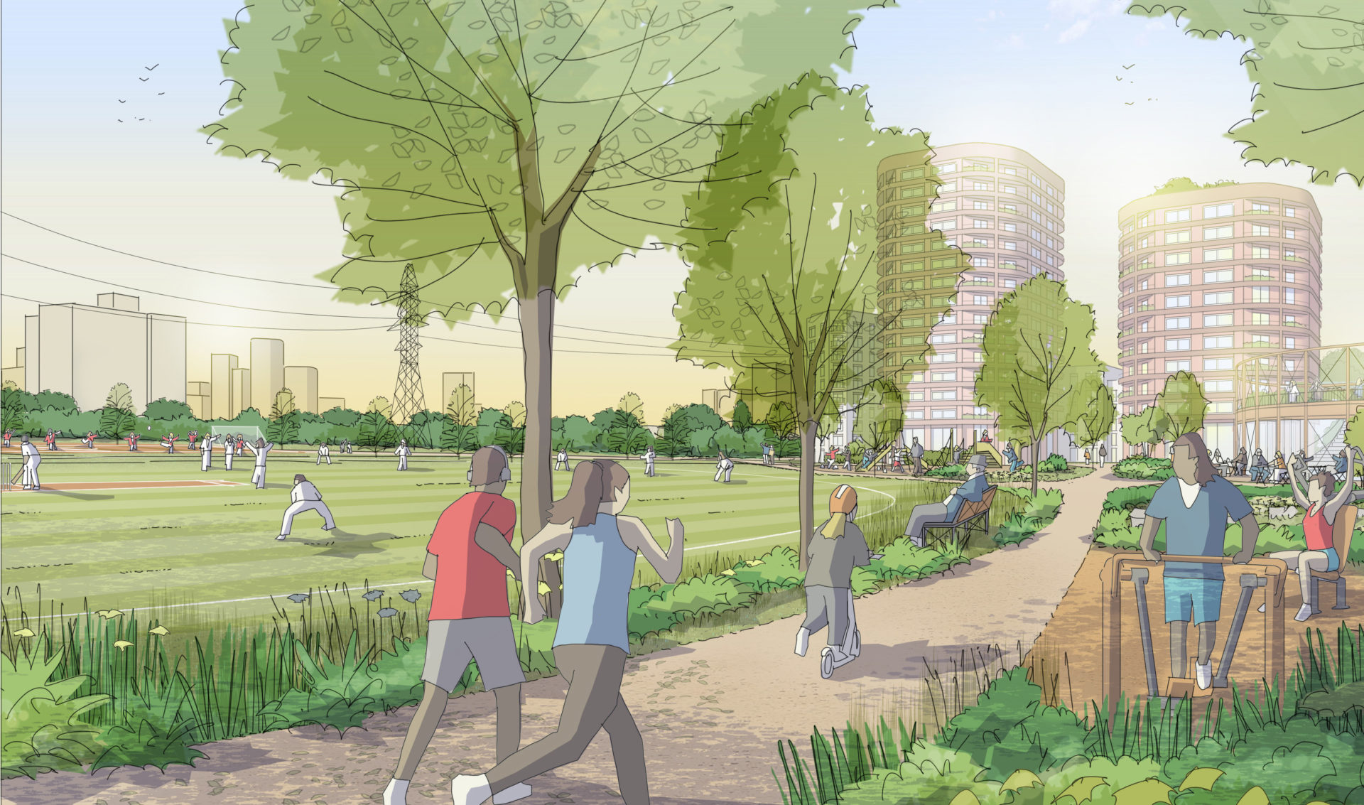 A new public park, sports facilities and residential neighbourhood of around 600 homes.