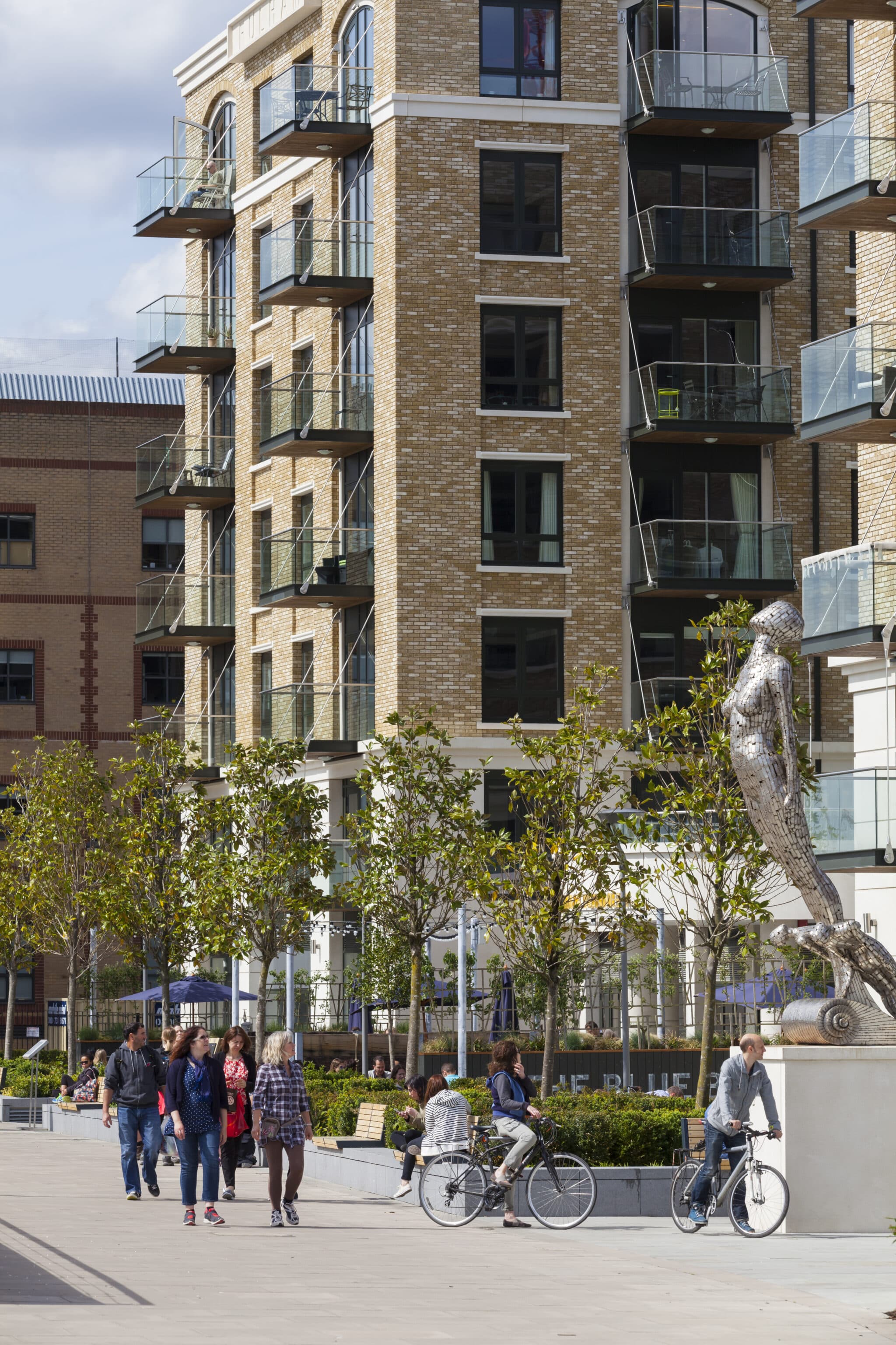 Soft landscaping and street trees enhance biodiversity and help define the hard landscape by forming shade and natural resting areas, encouraging users to move into the site and enjoy the street facilities. Underground parking and a vehicular access strategy enable over 50% of the site to be vehicle free public realm alongside nearly 1000 secure cycle spaces to promote cycling in the neighbourhood.