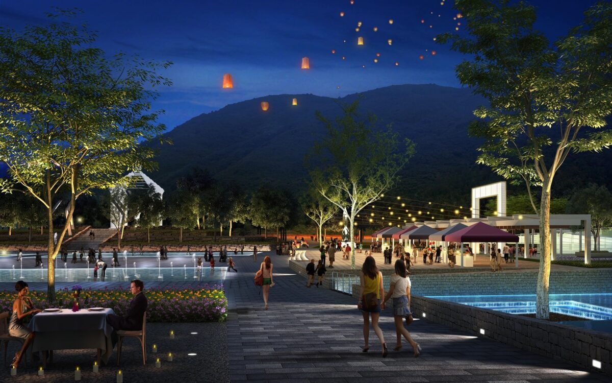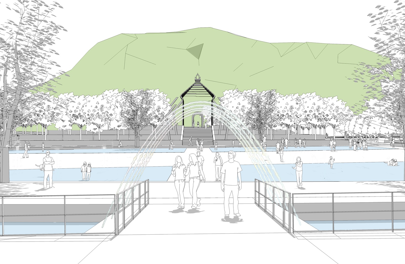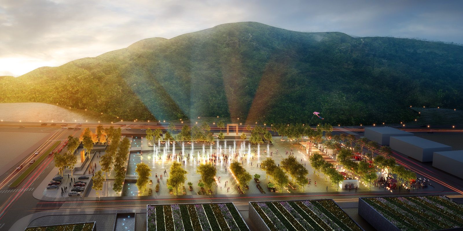 The square is composed as a ‘Jiugong Grid’ with four distinctive character areas inspired by Liubu’s native landscape: fields, orchards, mountains and springs. The ‘fields’ capture that linearity and regularity of agricultural land; the ‘orchards’ are an active space with vibrant colours and edible landscape; the ‘mountains’ are inspired by the terraced landscape, the wind and clouds; and the ‘springs’ is the versatile, interactive event space in the centre of the square – which will host seasonal activities such as summer music festivals and winter ice rinks.