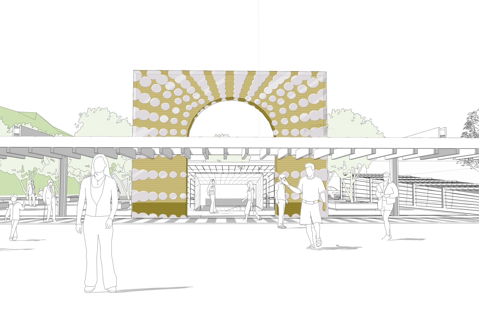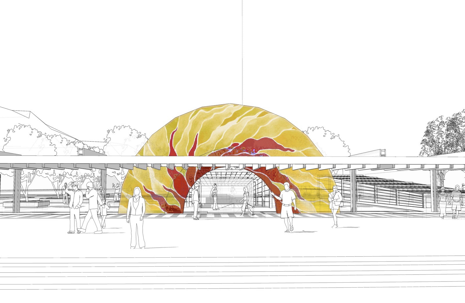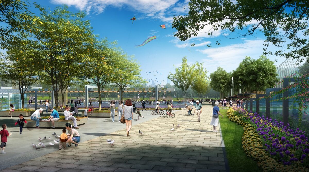 Four landmark gates punctuate the square and form a cultural loop. These gates are based on the five traditional Chinese elements: ‘Water’ the contemporary gate; ‘Fire’ the future gate; ‘Wood’ the eastern gate; and ‘Gold’ the western gate.