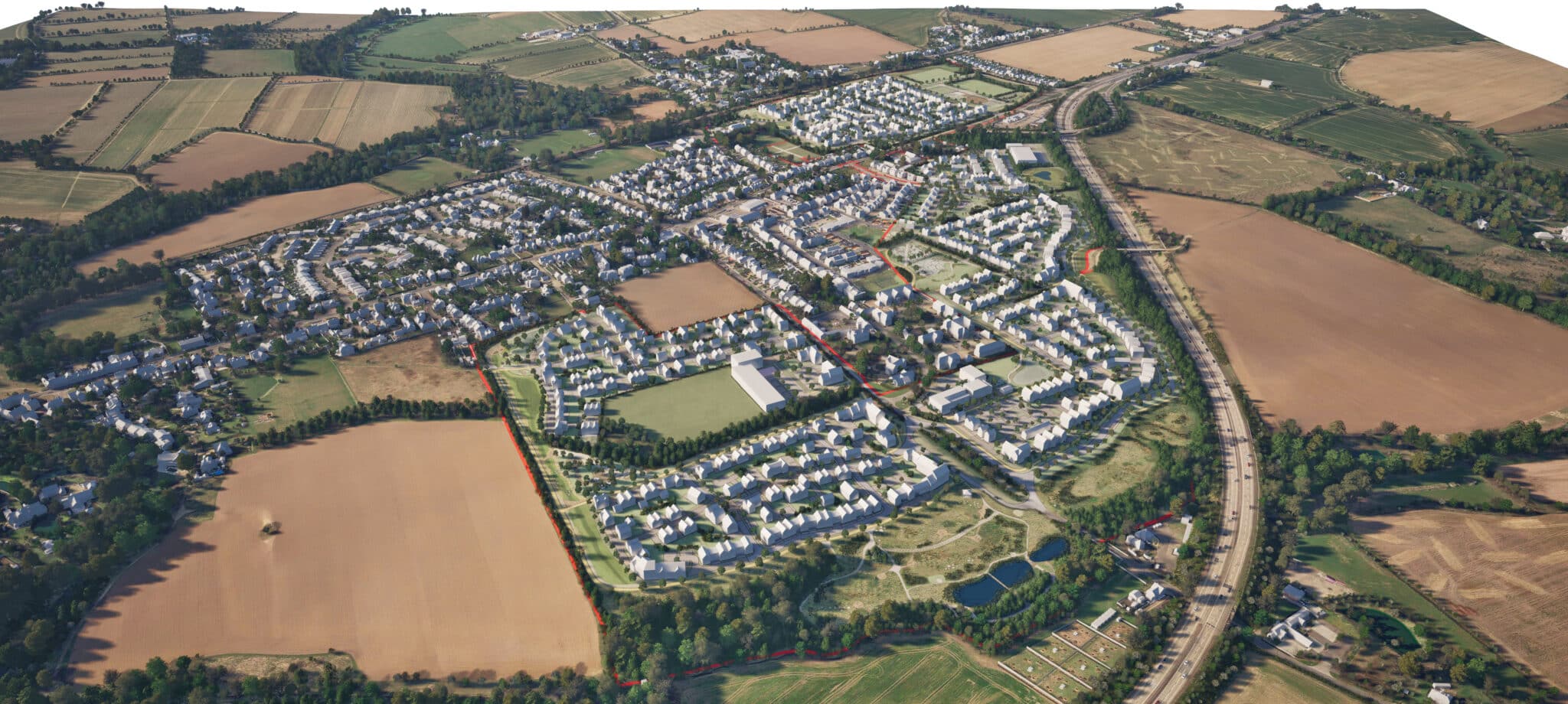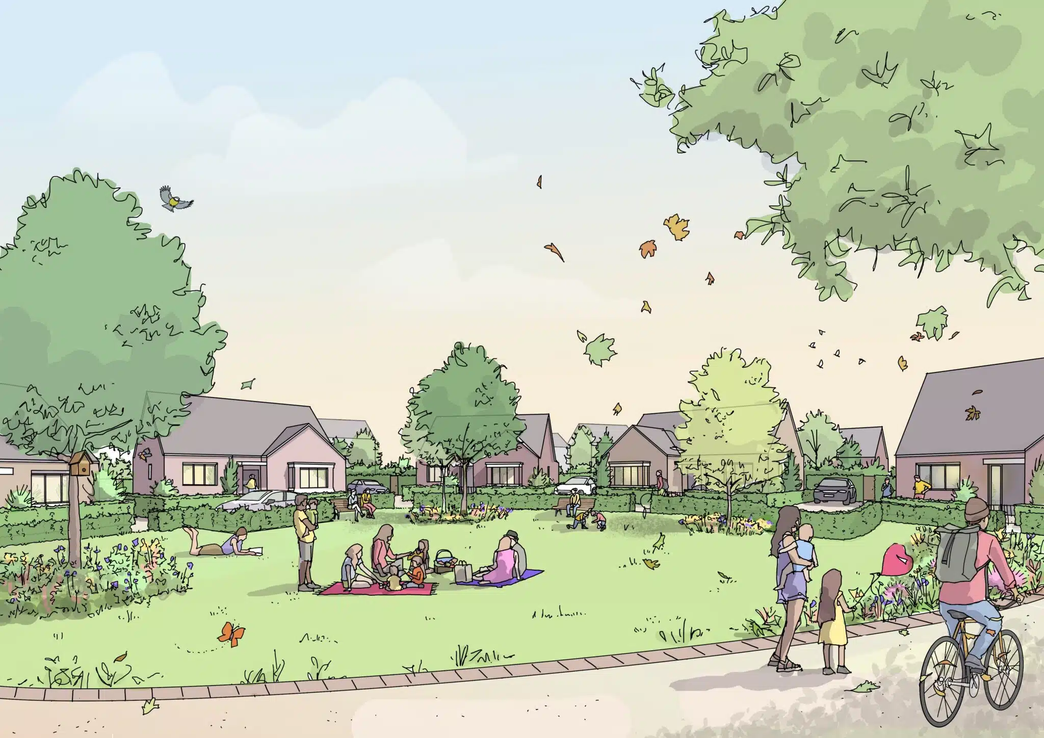 A landscape-led approach underpins the masterplan with interconnected green space covering over 40% of the site area, aiming to exceed over 10% in biodiversity net gain. A series of pocket parks, play areas, fitness trails, allotments, orchards and neighbourhood nodes are distributed throughout the site, with 5km of footpaths and cycle routes linking homes to community facilities and the wider countryside.