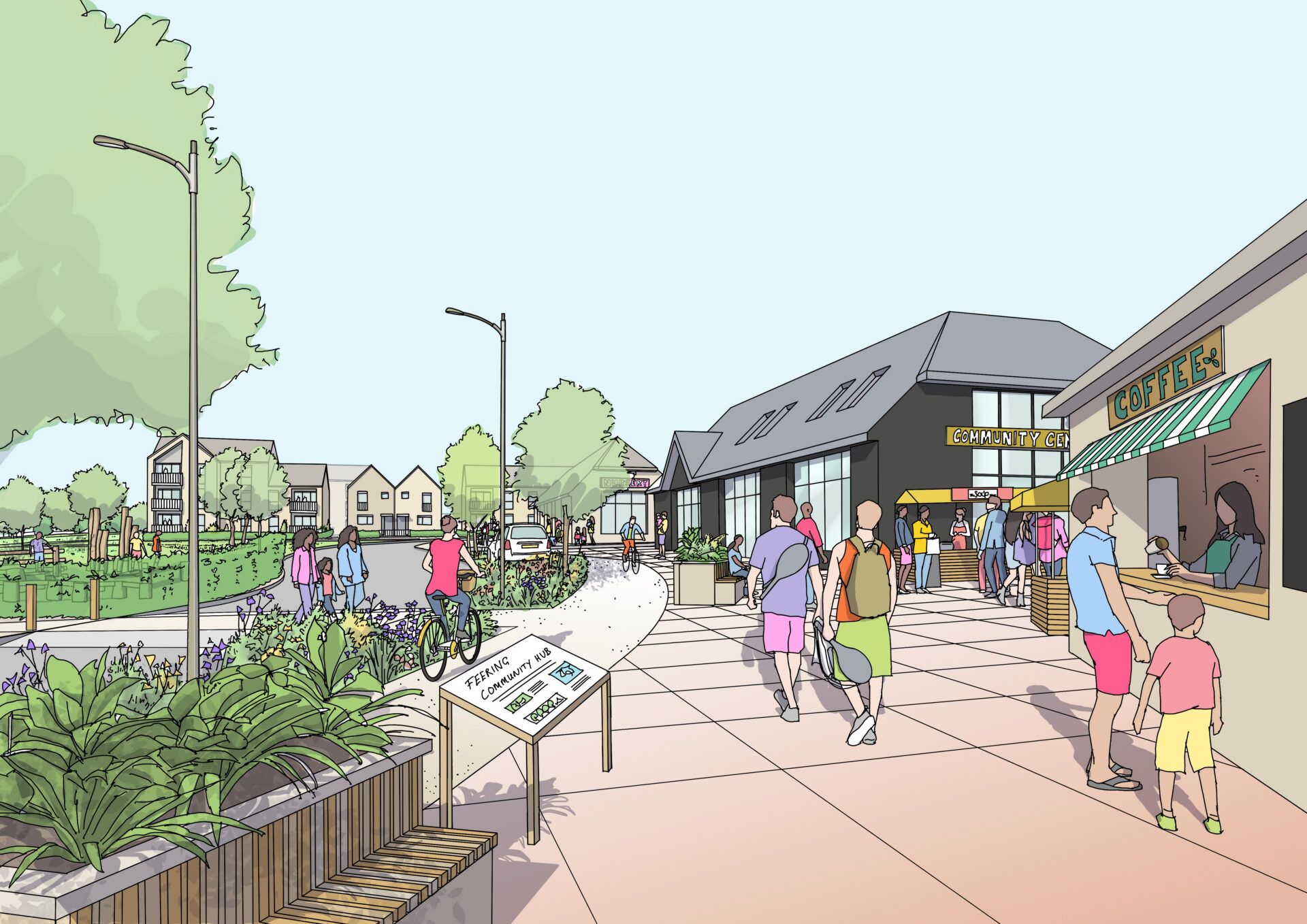A strategically positioned community hub and a mixed-use hub will act as the communal hearts of the neighbourhood, serving both the northern and southern parts of Feering. Alongside these assets, more than 3.5 hectares of sports facilities along New Lane help retain its open character, providing a gentle transition between new homes and the surrounding countryside.