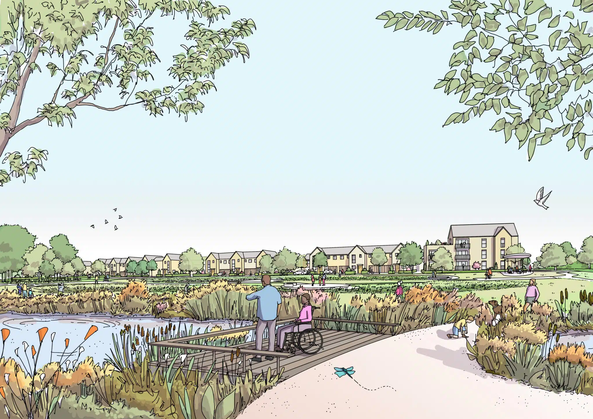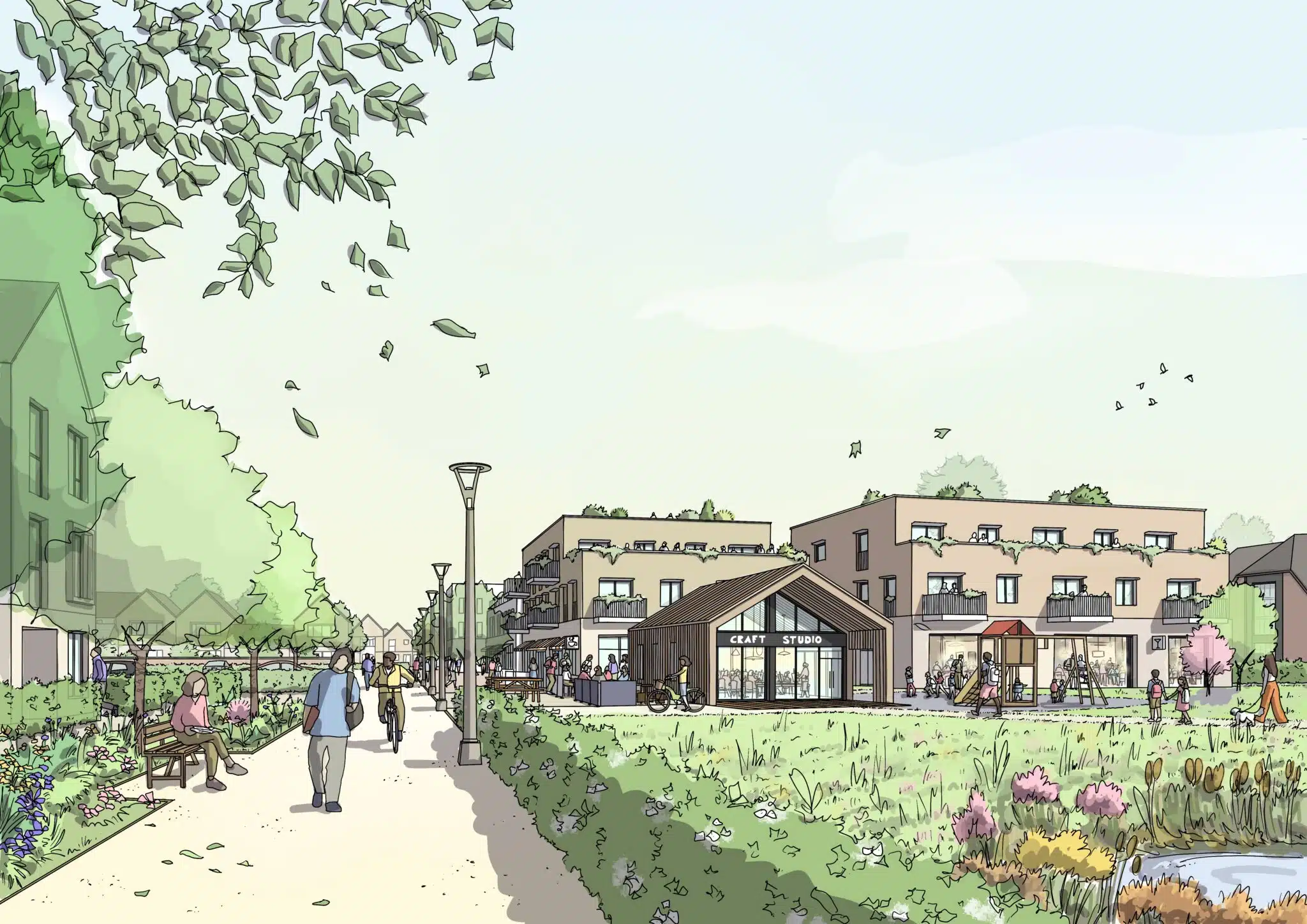 At the centre of the neighbourhood, the Central Green Space forms a safe and welcoming community focus. Overlooked by surrounding homes, it promotes everyday social interaction, incorporating a play area, landscaped SuDS feature and communal orchards to support shared food growing and celebrate the agricultural and horticultural heritage of the landscape and parish. Enhancements to the Domsey Brook corridor form a major area for habitat creation and nature-based recreation offering a rich network of routes, recreational opportunities and sustainable water management.