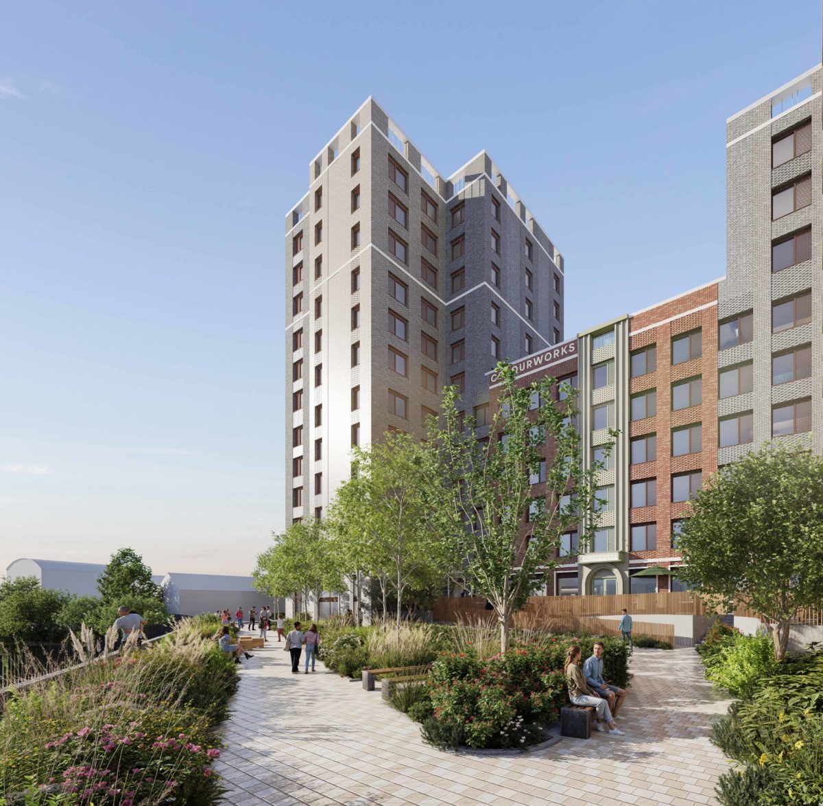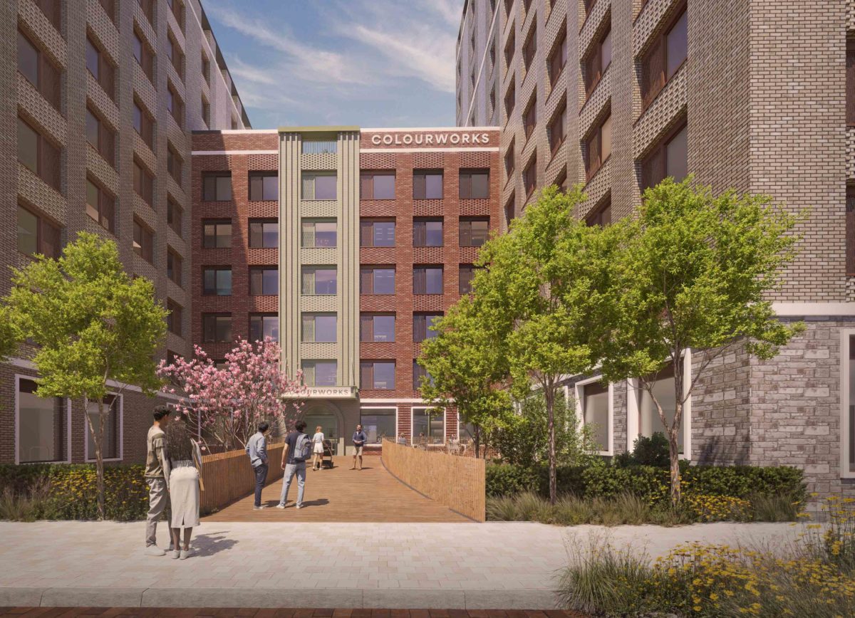 At ground level, 324sqm of community, workspace and amenity uses establish active frontages that animate the route between Eugene Street and Frome Colourworks, creating an engaging movement corridor and a well-integrated public realm. The prominent community hub has been developed in close collaboration with the local community including Albaseera Bristol Masjid who worked with the design team on a potential brief and layout. This has shaped a dedicated facility that responds directly to local needs and anchors it within its neighbourhood.